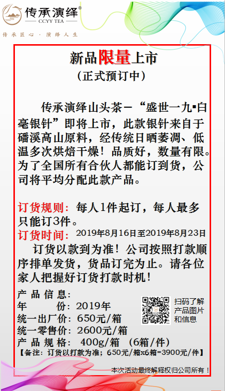 传承白茶的传统制作技艺精髓,潜心于白茶工艺的每一个细节,用心把控每一片茶叶,从原料到成品的每一个环节,都做到“高标准、严要求”,力求呈现白茶的最高品质,“传承匠人匠心之精神,演绎白茶艺术之美”。——只做可传承的好白茶。