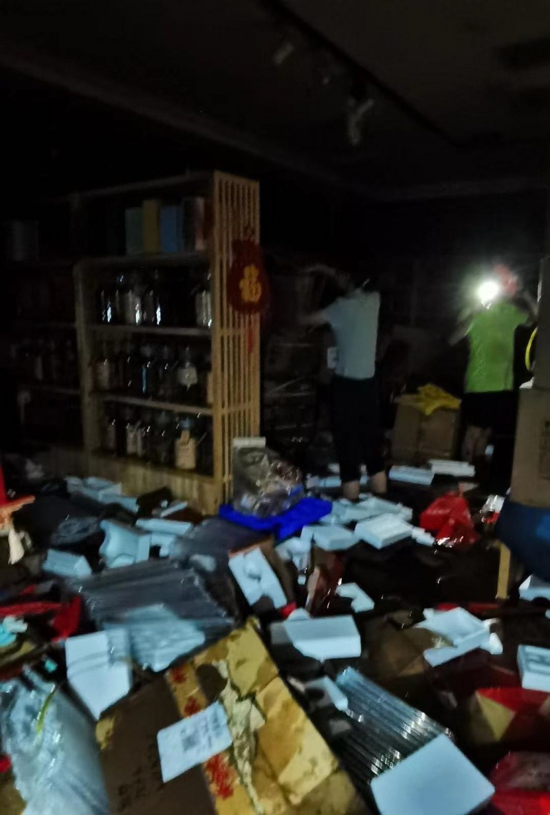 “从下午一点多,我、老婆还有店员就开始抢搬茶叶,起初我们尽量紧着价值贵重的茶叶搬运,想起什么搬什么。但是到后来雨越下越大,店里就像战场一样,泡水的茶叶越来越多,也就顾不得那么多了,什么顺手就赶紧抢搬什么,当时店里的女生也都很能干,抱着成箱的茶叶往货架上方搬运。直到凌晨一点多我们才结束,连着搬了十二个小时,但是还是有三分之一的茶叶没有保住。”