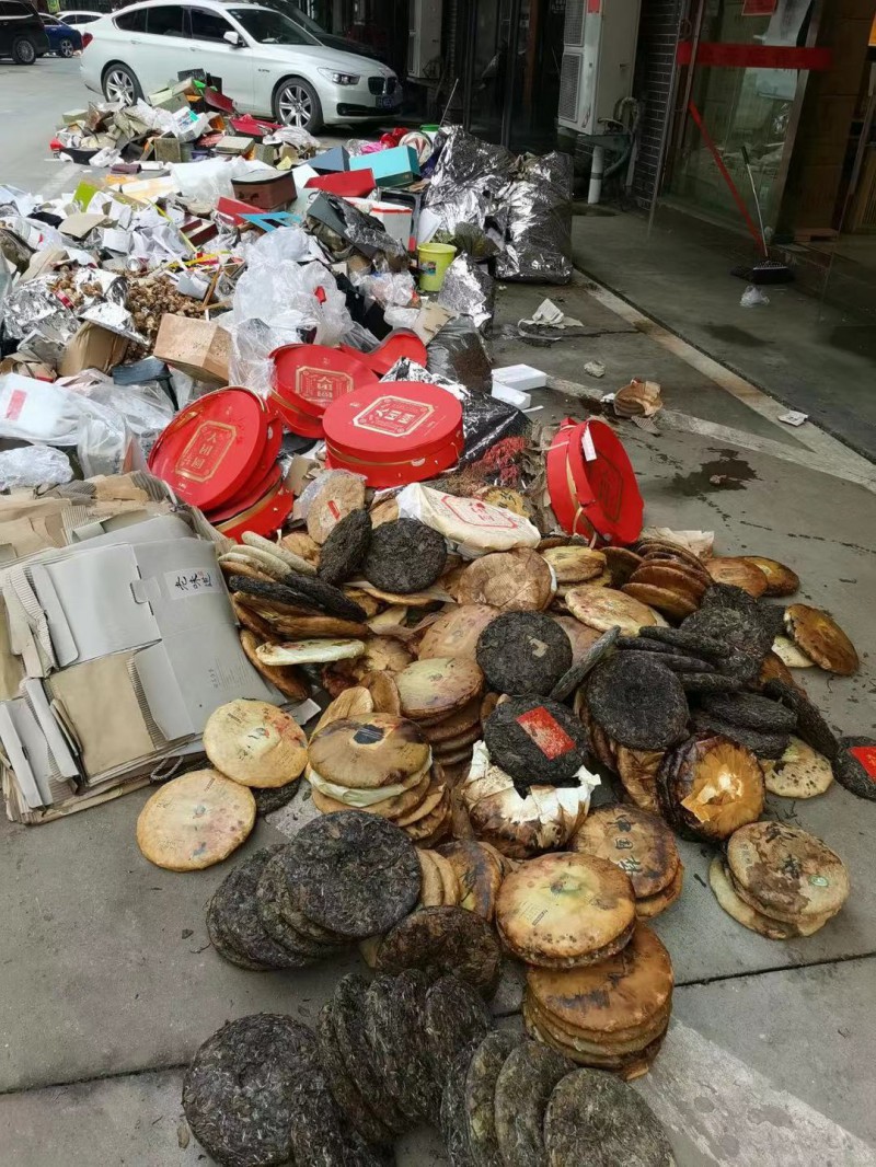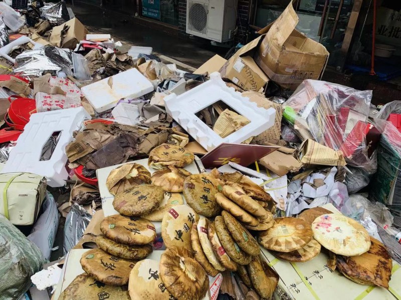 从当时现场的的图片中可以看到,整个华香源茶业店里现场状况惨不忍睹,仅福鼎白茶就损失了将近二百件。直到22号大水慢慢退却以后,林培养带着店员才得以把浸过水的茶叶扔到门口,泡水茶叶堆积起来像一座小山丘,得有好几车。