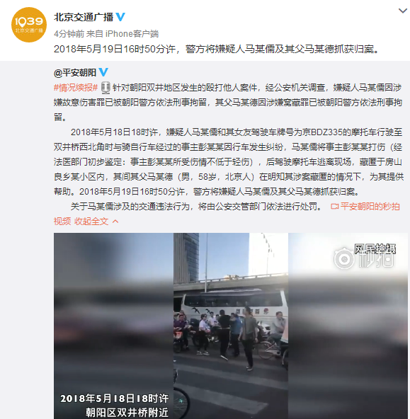 2018年5月18日18时许,嫌疑人马某儒和其女友驾驶车牌号为京BDZ335的摩托车行驶至双井桥西北角时与骑自行车经过的事主彭某某因行车发生纠纷,马某儒将事主彭某某打伤(经法医部门初步鉴定:事主彭某某所受伤情不低于轻伤),后驾驶摩托车逃离现场,藏匿于房山良乡某小区内,其间其父马某德(男,58岁,北京人)在明知其涉案藏匿的情况下,为其提供帮助。2018年5月19日16时50分许,警方将嫌疑人马某儒及其父马某德抓获归案。