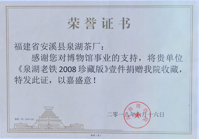 泉湖老铁2008收藏级产品是由福建省收藏家协会老茶研究会监制、河南博物院收藏、中国太平洋保险公司质量承保的陈香型铁观音。产品质量通过国家茶叶质检中心48项检测,符合国家各项质量标准,是一款值得品鉴与收藏的陈香型铁观音。寻找原产地茶王组委会发起人王志刚介绍泉湖老铁是寻找原产地茶王组委会寻茶组首批原产地合作企业也是重点推广宣传单位。