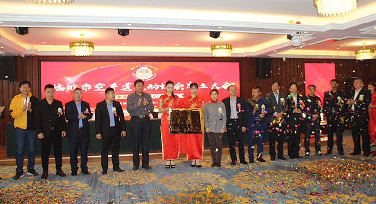 到会领导以及临沂市空手道运动协会法人、会长、名誉会长等共同为临沂市空手道运动协会揭牌。