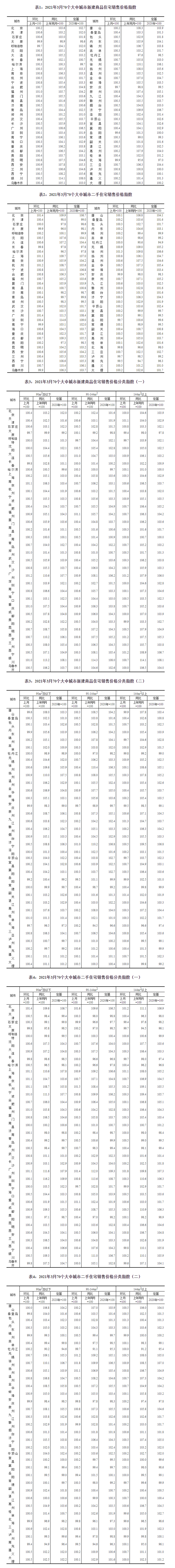 国家统计局公布2021年3月份70个大中城市商品住宅销售价格变动情况。