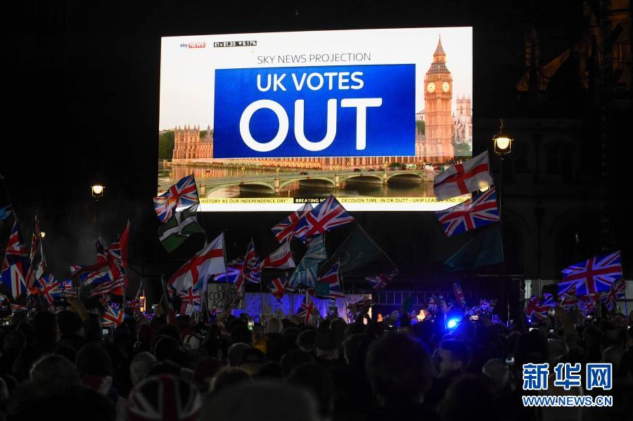 1月31日晚,在英国伦敦,支持“脱欧”的人们在议会广场集会,庆祝“脱欧”。大屏幕上显示“英国选择脱欧”。伦敦时间1月31日晚11时,英国正式“脱欧”,结束其47年的欧盟成员国身份。新华社发(史蒂芬·程摄)