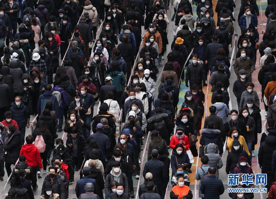 3月3日,人们在韩国首尔的百货商店外排队购买口罩。新华社记者 王婧嫱 摄