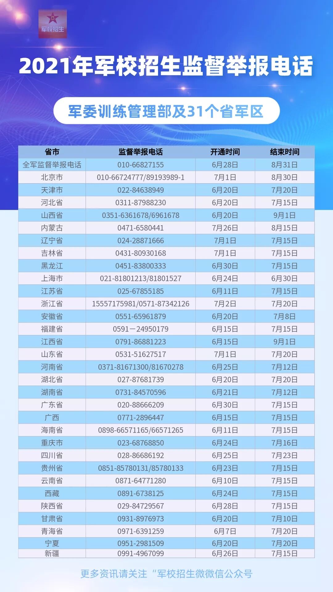 记者6月28日从山东省教育招生考试院获悉,军校招生官微日前公布了各地军校招生监督举报电话,图表如下: