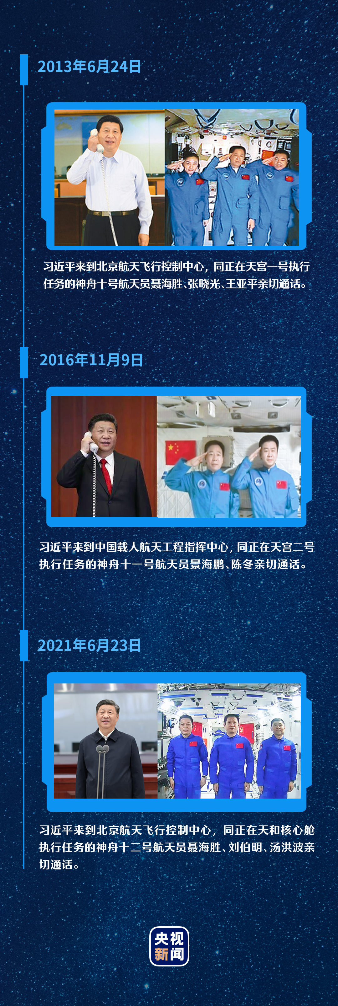 习近平总书记高度重视我国航天事业发展。从神舟十号对接天宫一号,到神舟十一号对接天宫二号,再到神舟十二号对接天和核心舱,总书记三次与在太空执行任务的航天员进行天地通话,关心他们的工作、生活情况,嘱托他们圆满完成航天任务。