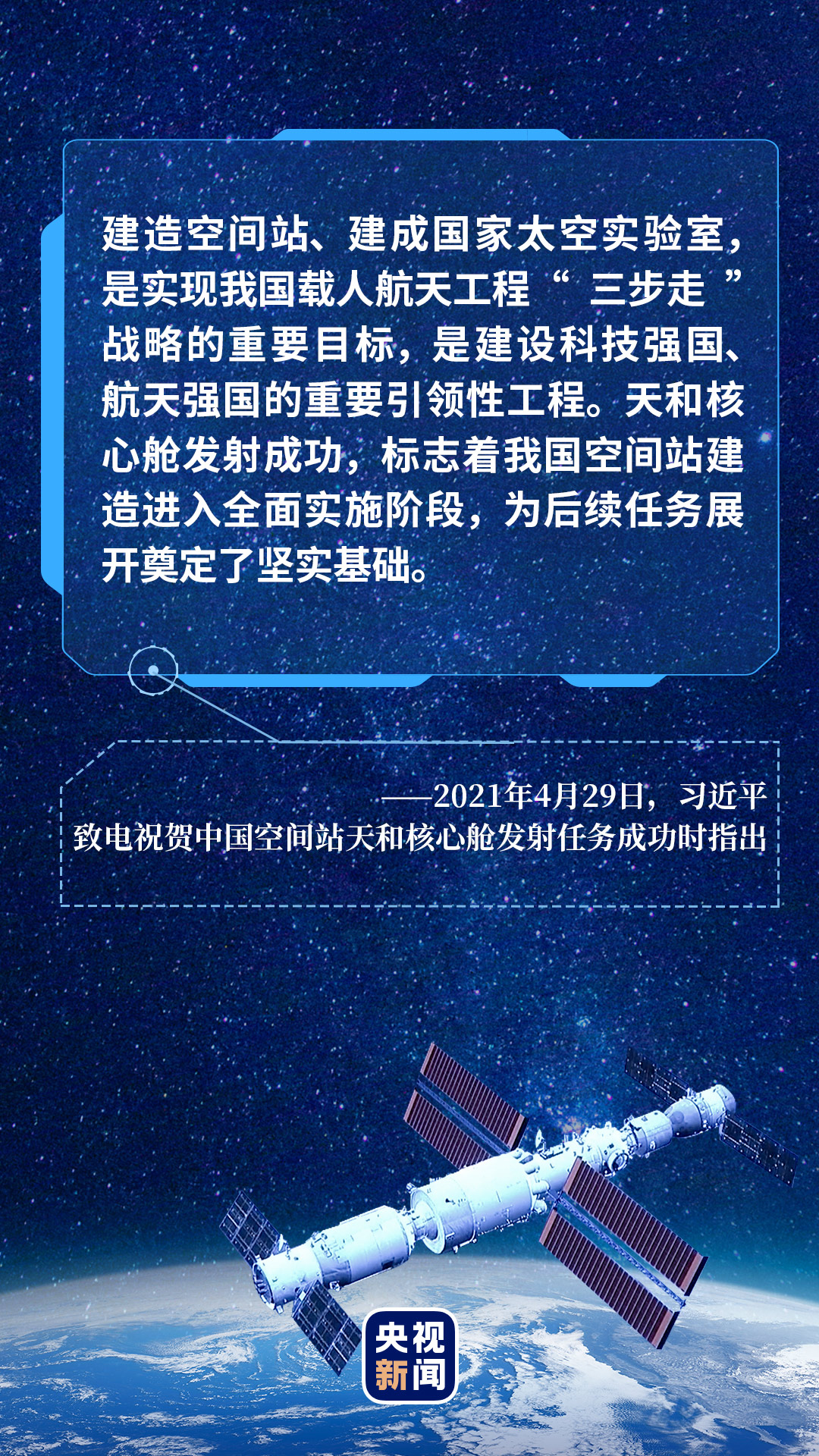 “建造空间站,是中国航天事业的重要里程碑,将为人类和平利用太空作出开拓性贡献。你们是新时代中国航天事业无数奋斗者、攀登者的代表。希望你们密切配合,圆满完成后续任务!祝你们在太空工作生活顺利,我们在北京等候各位凯旋!”
