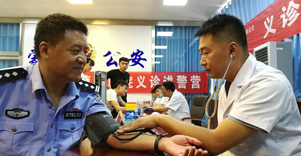 7月31日,在“八·一”建军节来临之际,临沂市人民医院携手临沂同德中医医院冒着酷暑来到蒙山旅游度假区公安分局进行义诊,为保卫蒙山安全的干警、协警和防火队员送上了一份健康大礼。