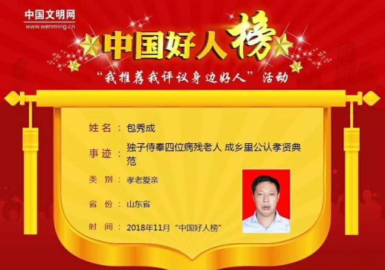 11月29日,中央文明办在宁夏回族自治区举办全国道德模范与身边好人现场交流活动,同时发布11月“中国好人榜”,临沂市平邑县包秀成同志光荣入选“孝老爱亲好人”!