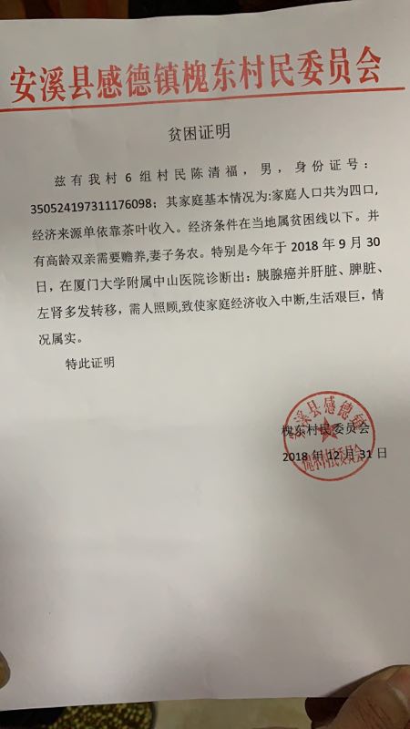 各位尊敬的爱心人士,你们好,我叫汪丽春,陈清福(陈虎江)是我的丈夫,今年45岁,福建省泉州市安溪县人,丈夫向来善良随和,待人真诚,爱岗敬业,是我坚强的依靠,能和他结为夫妻是我此生最幸运的事,结婚以来我们对待生活一直乐观积极,努力上进,谁知天意弄人,2018年07月18日那天,丈夫被诊断为胰腺癌并肝脏脾脏左肾多发转移,现在正在厦门大学附属中山医院治疗,这么好的一个人怎么忽然就遭此厄运,每每见到丈夫躺在病床上,痛苦和绝望就向我袭来,但是我不能倒下,我一定要乐观坚强,这个家庭才有希望,现在我所有的期盼就是希望他能赶紧好起来,无论他之后变成什么样,我只想全心全力照顾他对他好。到现在为止为丈夫治病已经花费了125000元,医生说后续的治疗至少还需要200000元,朋友也都热心地帮助我们,两家人都在全力帮忙为丈夫治疗,无奈治疗费用还是有很大缺口,只能求助社会爱心人士可以伸出援助之手,为热爱生活之人带去一份生的希望,感谢每一位好心人,感谢你们的善心和恩情,哪怕您只是一次转发,一句加油,都是对我们莫大的支持与帮助,愿善念永存,愿爱心传递!谢谢你们恳请各位好心人士伸手相助,多多转发,您的每一次转发对我们都至关重要,每一次转发对我们来说都是莫大的帮助!