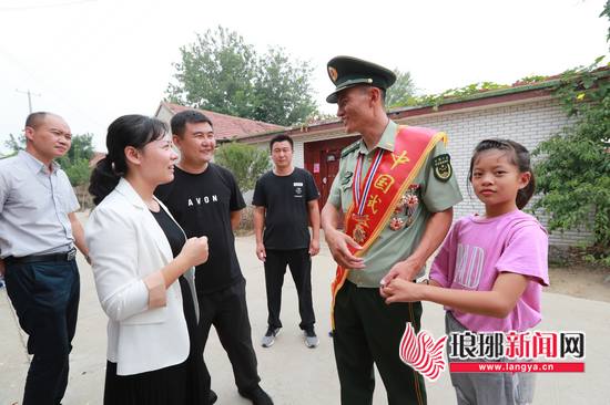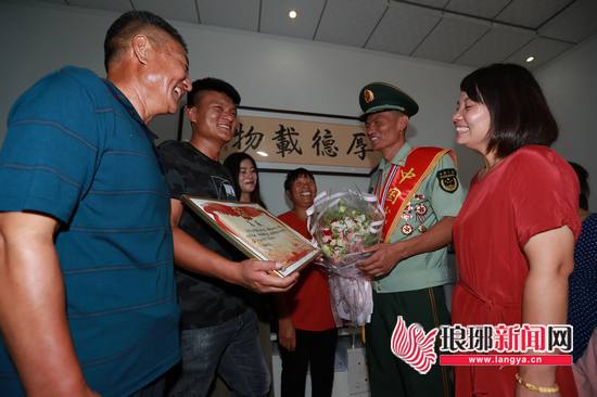 建功在部队,荣誉送故乡。8月27日上午,武警天津总队机动支队和临沂市退役军人事务局、兰陵县委县政府及县人武部、退役军人事务局等单位相关领导一起将“中国武警十大忠诚卫士之家”牌匾送到王宝虎家里。