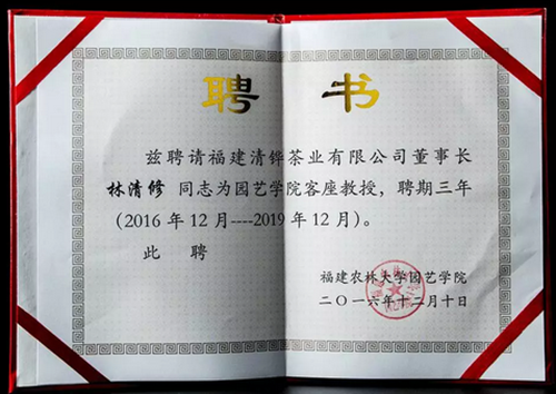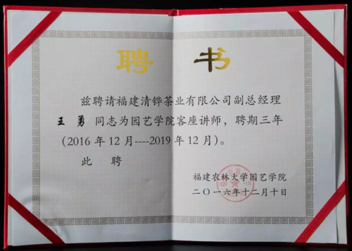 热烈祝贺福建清铧茶业股份有限公司董事长——林清修先生被聘请为福建农林大学园艺学院客座教授;福建清铧茶业股份有限公司人资行政部副总经理——王勇先生被聘请为福建农林大学园艺学院客座讲师!
