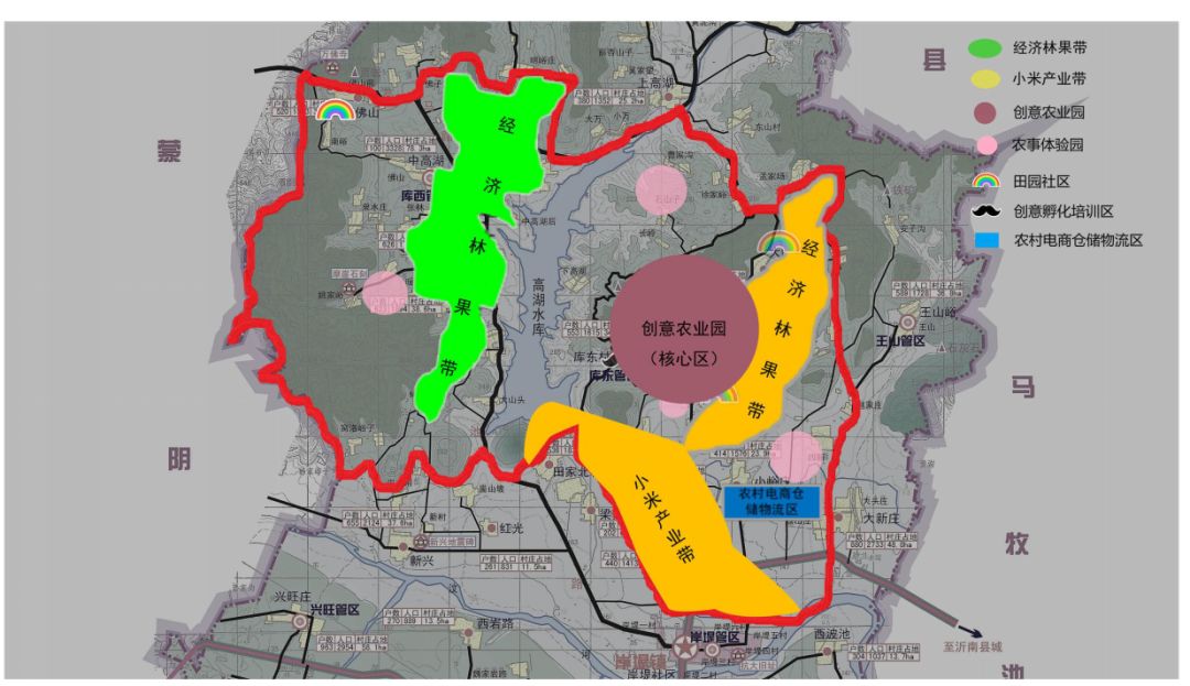 工作中,通过农业生产将产业、生态、休闲娱乐、养生度假、文化艺术等进行深度融合,探索建立模式多样、定位准确、特色鲜明、宜居宜业、惠及各方的田园综合体。沂南县朱家林田园综合体项目以乡村文创产业聚集的创意小镇为核心和特色,以沂蒙小米、珍珠油杏、草莓等特色林果为主导产业,确立了“一核两辅两带五区”的空间布局(“一核”是朱家林创意小镇动力核,“两辅”是石旺庄省委党校岸堤校区、柿子岭乡伴理想村,“两带”是小米杂粮产业带、高效经济林果带,“五区”是创意农业区、田园社区、电商物流区、滨水度假区、山地运动区),把偏远的山村变成了集数字孪生、人才培训、标准化研究、电商物流等于一身的“金凤凰”。