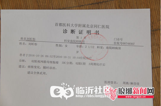 家里人最早发现彤彤的异常,是在2016年6月份。早已学会走路的彤彤却在快到2岁时被发现走路老是摔倒,眼睛好似看不清楚。刘钦磊带着彤彤来到医院做检查,被告知情况严重,让去北京的大医院做检查。6月份,不满2岁的彤彤被诊断出双眼患有视网膜母细胞瘤——一种婴幼儿眼病中,最严重、也是危害最大的一种恶性肿瘤(俗称眼癌)。