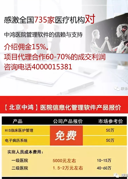 顺应医疗行业市场需求,中鸿光德在2018年致力于打造唯一代理人地推引流的整合营销模式,以服务患者为宗旨,以提升医院服务目的,以互联网服务平台为载体,以符合网络线上传播及传统线下传播的方法和理念来展开实施营销活动,和当地代理商共同免费为医院部署手机微网站,微信小程序,HIS系统,电子病历系统,预约挂号支付系统,在线检诊系统,在线医疗论坛,患者随访系统,医保农合接口系统等医院应用软件,扩大医院品牌宣传,患者随访锁定,高效提升医院效益。收取医院患者收入5%-20%佣金。期待与您的永久合作。