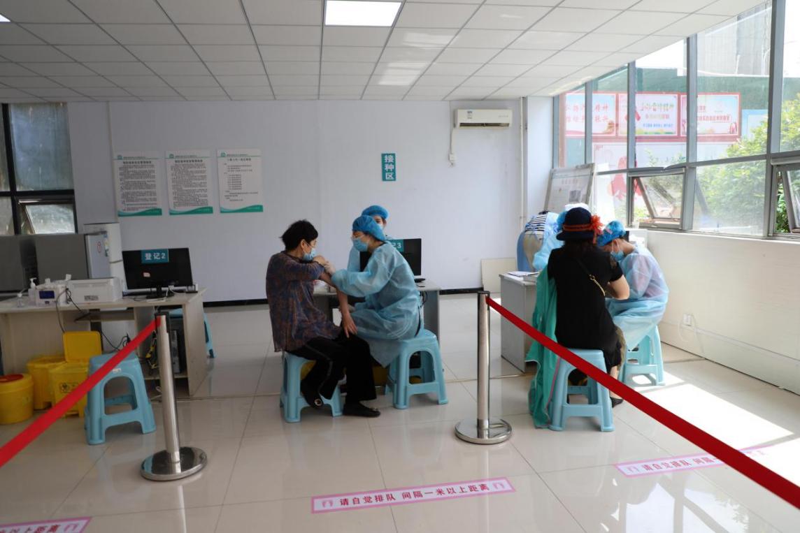 晚上7点半,柳青苑社区的王大妈一家吃过晚饭,来到物业中心接种新冠疫苗。此时,物业中心排队接种的社区居民越来越多,柳青街道社区服务中心流动接种队的医务人员有条不紊地进行着接种工作。