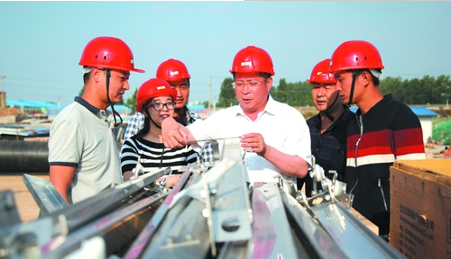 5月24日,在临沂市柳青河第二污水处理厂建设工地,项目督察人员在检测即将安装的刮泥机配件。