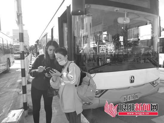 在临沂火车站公交换乘中心,市民正在使用“掌上公交”APP查询公交线路。