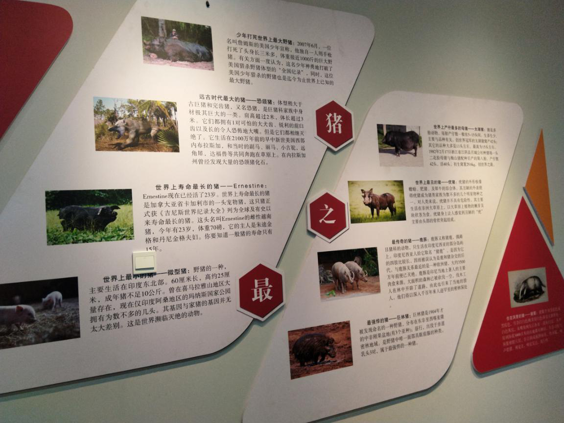 2019年是农历己亥猪年,猪是我国十二生肖中排在末尾的压阵属相,民间谚语有“六畜兴旺猪为首,五谷丰登粮领先”之说。在中国传统文化与民间传说中,猪年常被视为丰收之年,有五谷丰登、六畜兴旺的美好寓意,自古便有着丰富深厚的文化象征意义。猪文化在我们的生活中占据着十分重要的地位。日前,平邑县瑞丰养殖有限公司建设的全市第一家猪文化展馆正式对外开放。展馆共投资80余万元,分两个展厅,总面积450多平方米,通过文字、图片、实物、雕塑、音像资料等,生动形象地介绍了猪的历史文化、进化演变、民俗传统、营养美味及传统养猪、现代养猪等方面知识,吸引了周边群众前来参观学习,了解猪文化。该公司还种植了2000亩黄桃,春天游客可以来观赏桃花,秋天可以来采摘黄桃,还可以品尝地道的沂蒙黑猪肉,真正实现了“种植养殖--餐饮住宿--休闲娱乐--旅游观光”的农牧循环和有机融合。