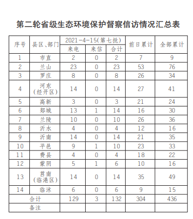 4月15日,省第六生态环境保护督察组向我市交办第七批信访举报件共132件,共涉及13个县区和3个市直部门。其中:兰山区23件、罗庄区8件、河东区经开区)14件、高新区3件、郯城县14件、兰陵县10件、沂水县 4件、沂南县14件、平邑县10件、费县4件、蒙阴县6件、莒南县(临港区)14件、临沭县6件、市直部门2件。