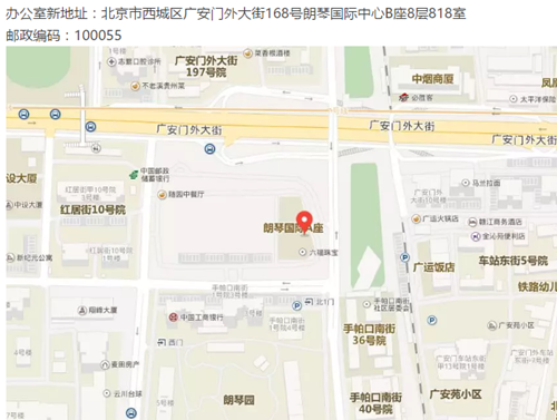 办公室新地址:北京市西城区广安门外大街168号朗琴国际中心B座8层818室