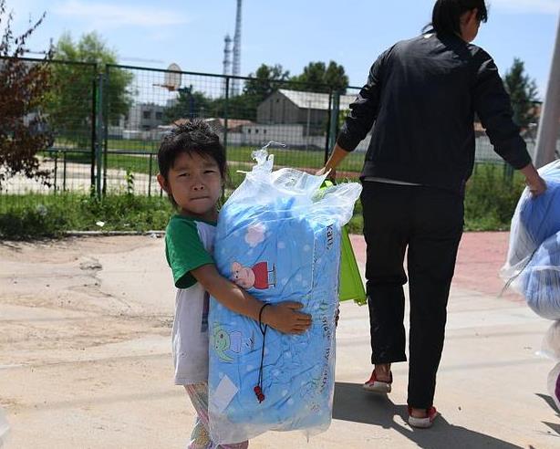 无论家里遭受的洪涝灾害多严重,家长们放下家里的急活,送孩子前来报到。新生入学报到现场,一名新生的妹妹来送姐姐上学,怀里抱着姐姐要用的被褥。
