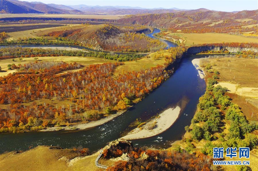 金秋十月,位于大兴安岭南麓的内蒙古呼伦贝尔大地披金,层林尽染,美景如画。这是10月5日在内蒙古呼伦贝尔扎兰屯市柴河风景区拍摄的秋景。新华社发(韩冷 摄)