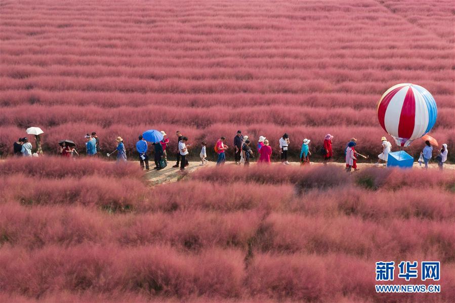 国庆假期,江苏南京溧水区郭兴庄园种植的景观植物粉黛乱子草进入盛花期,成片的“粉红田野”吸引了众多游客。这是10月3日,游客在“粉红田野”中游玩 新华社发(苏阳 摄)。