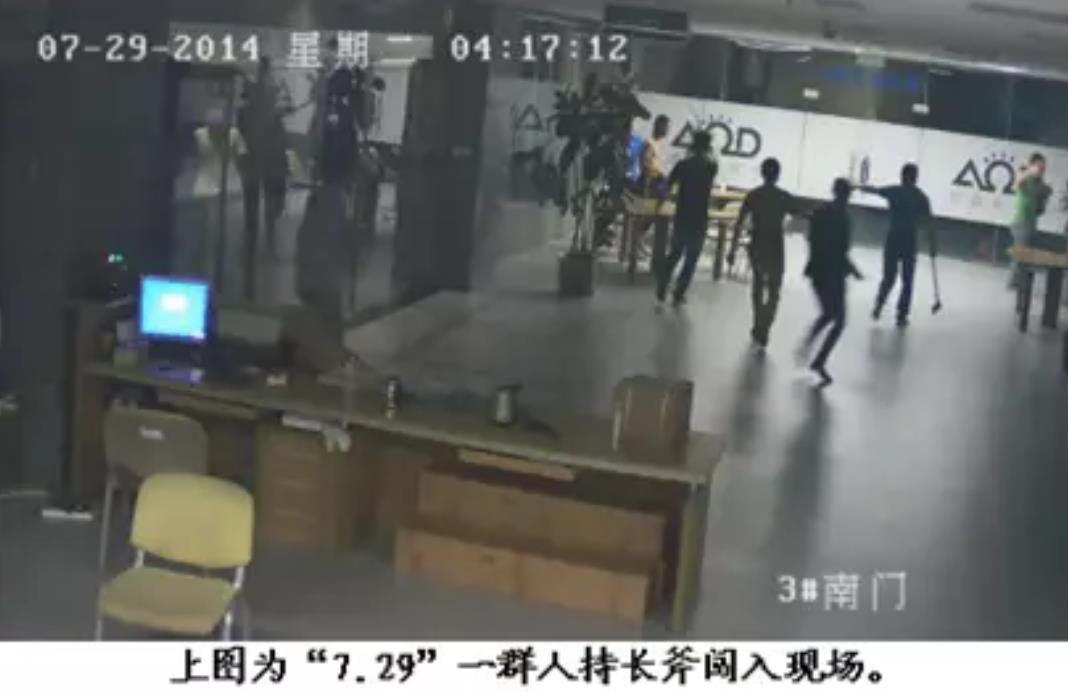 视频显示,一群人手持大斧头闯入一单位,围住几位保安后,又冲向他处……