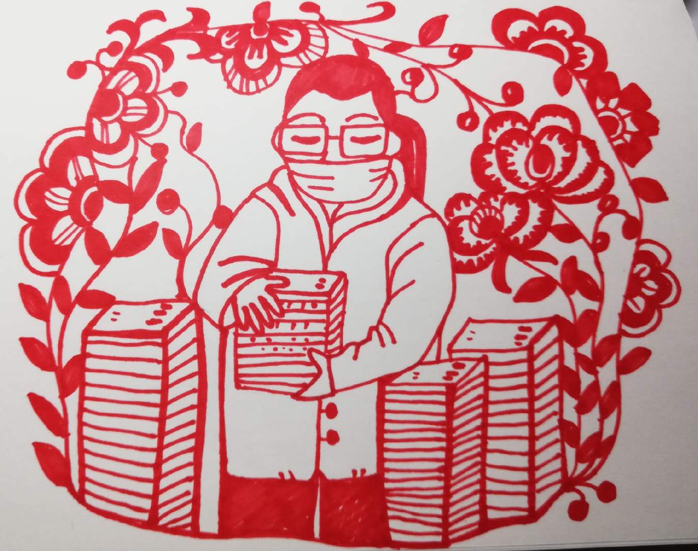 这一幕幕令人感动的场面,牛鑫老师情不自已,发挥自己的艺术所长,利用手中的剪刀和红纸剪纸创作,剪出了一幅幅分书、送书、收书的作品,把感人的场景用这种古老的民间艺术记录身边的“战疫人”,以此温暖他们,用艺术的力量致敬,助力疫情防控,用这些作品表达美好祝愿。(赵玉娟)