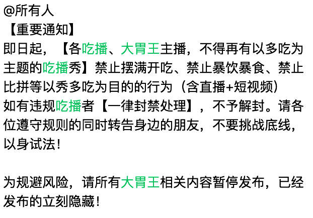 据悉,眼下已有不少平台主播、机构顺应央视号召,主动进行删除相关立意作品、清空或注销账号等整改措施,停止以多吃为目的的直播、短视频创作。相关消息已经引起诸多同行的关注,今天不少行业社群也在传播一条所谓“重要通知”的内容。