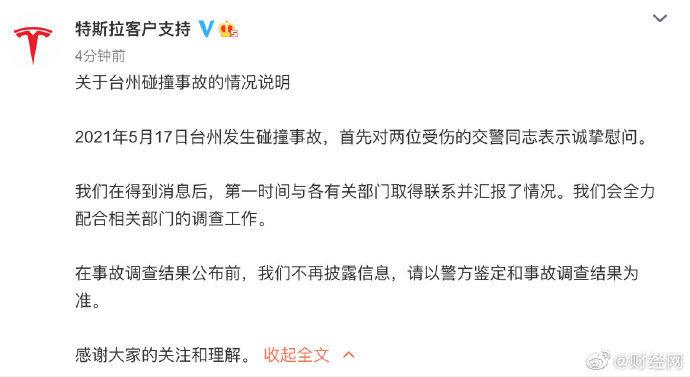 每经AI快讯,特斯拉客户支持微博刚刚发声明回应台州碰撞事故。2021年5月17日台州发生碰撞事故,首先对两位受伤的交警同志表示诚挚慰问。我们在得到消息后,第一时间与各有关部门取得联系并汇报了情况。我们会全力配合相关部门的调查工作。在事故调查结果公布前,我们不再披露信息,请以警方鉴定和事故调查结果为准。感谢大家的关注和理解。