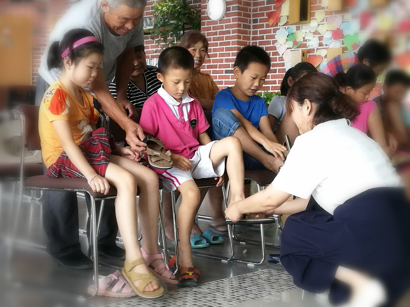 沈红霞部长为孩子穿上鞋子