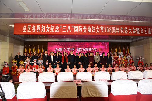巾帼心向党·建功新时代。为深入学习宣传贯彻习近平新时代中国特色社会主义思想和党的十九大精神,纪念“三八”国际妇女节108周年,3月7日上午,罗庄区妇联举行“巾帼心向党·建功新时代”纪念“三八”国际妇女节大会。区委副书记王士力;区委常委、宣传部长王兆艳;区人大常委会副主任、区纪委廉政教育中心主任杜宝珍;区政协副主席、红十字会会长何雪;区政府副区长王晖青;区循环经济示范区主任徐秀兰及有关部门负责同志出席了会议。区政协女委员,各镇街、各部门主要领导和受表彰的先进集体和先进个人共400余人参加。