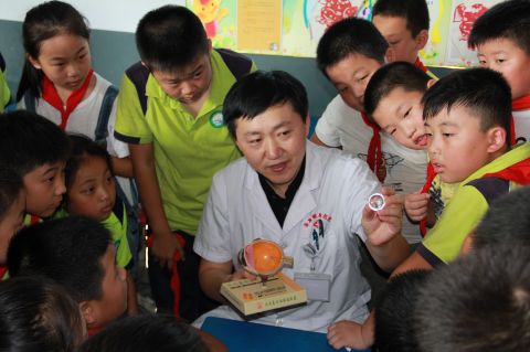 9月11日,在兰山区白沙埠镇中心小学,来自鲁南眼科医院的专家俎训山近距离给孩子们讲解眼球的构造。当日,临沂市爱眼护眼教育基地暨鲁南眼科医院爱眼护眼巡讲第十站走进当地农村学校,通过视频短片、动漫展示、互动问答等生动活泼、丰富多彩的形式,普及爱眼护眼知识,倡导孩子们正确科学用眼,用心呵护眼睛,维护视力健康。(王伟勋 孙艳伟 摄)