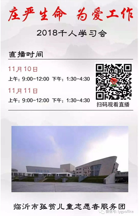 据了解,本次公益大讲堂的孤贫儿童志愿者千人学习会将采取网上直播直播的形式全球分享,直播通道请关注微信公众号“临沂孤贫儿童服务团办公室”。