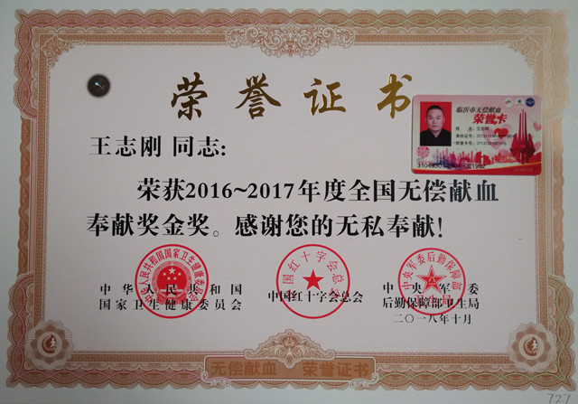 本站编辑王志刚荣获临沂市“三免政策”及全国无偿献血金奖