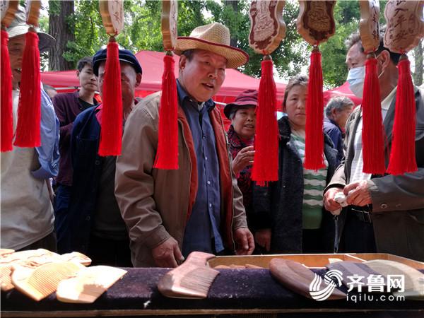 在一处木制工艺品品摊前,众多市民围观挑选木制品工艺品。