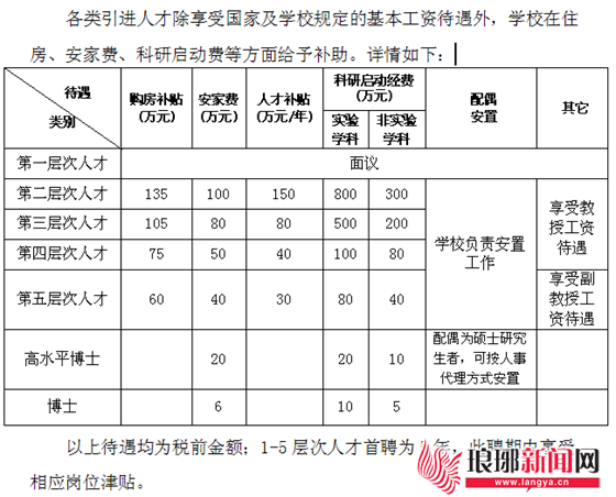博士招聘各类引进人才除享受国家及学校规定的基本工资待遇外,学校在住房、安家费、科研启动费等方面给予补助。第1至5层次人才首聘为5年,此聘期内享受相应岗位津贴。