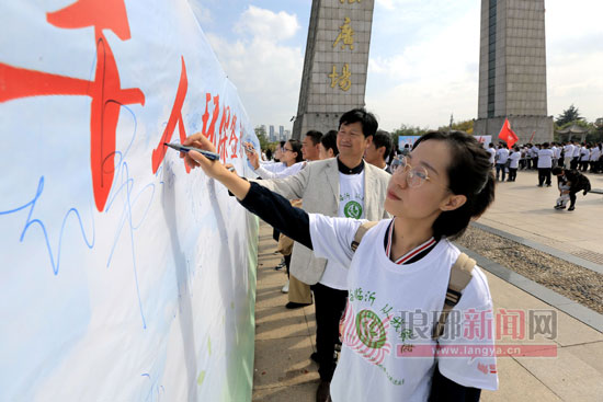 琅琊新闻网10月15日讯(记者 唐霞) 15日上午,“生态临沂,从我做起”千人环保签名活动在临沂书法广场举行。百名“金锣杯”第二届魅力临沂环保形象大使选拔赛晋级选手,与来自其他各行各业的环保志愿者们庄严宣誓,并在环保签名墙上郑重写下自己的名字。