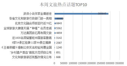 梳理本周文旅行业热点信息,文化名人武侠小说家金庸逝世引发全民讨论,话题热度持续居高。此外,舆论重点关注的话题包括:各省文化和旅游行政部门集中亮相,未来文化和旅游走向引热议;北京文化融合发展项目签约近70亿创历史新高,“文化+”新兴业态对经济拉动作用不断增强;万达文旅布局及天猫动态等。此外,新晋9家5A景区授牌、11家4A景区摘牌、塞班滞留中国游客撤离等同样引舆论关注。