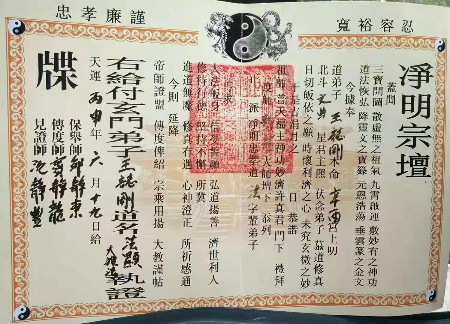 兹幸教阐玄都。经番贝叶。演混元上乘之道。见虚灵妙化之天。十六字薪传。彰明较着。五千言密旨。阐发详明。心一纯而魔自降。妙谛同参。性一静则窍皆通。法轮常转。谨按真言。伏冀如愿。早结菩提之果。悟彻玄牝之门。存心养性。练成九转大丹。伏虎降龙。超升三华胜境。有印有证。无折无磨。普兴过往祖先。现存眷属。永享逍遥。同证仁寿(弟子)等。下情无任。顶祝之至。